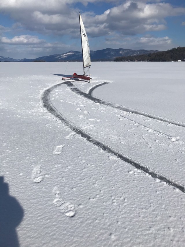 One of the most common questions from people curious about iceboating is if we can sail in the snow. We hem and haw about bonded vs. unbonded and maximum depths,etc, and about loosing split rings and clevis pins in the powder. But the deal deal breaker is the loads on the boat. Unless you’re sailing a Monotype or the Mary B. the loads really build up in all the wrong places.