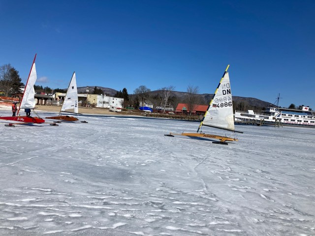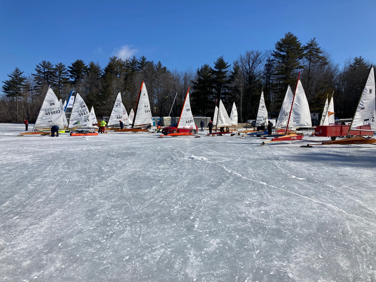 Results are still coming in, but in spite of the big winds and attrition rates we believe it’s in the books. Of thirty boats to start out, three completed the course, including the requisite walk on the beach at Center Harbor. Most of the fleet go to the top and looking downwind decided not to continue. The three who finished had major reservations about the downwind run, but since most of the lines were dead downwind they went for it. After the long bash to windward, coasting along dead downwind at true wind speed with no apparent wind was just sublime. Full sun, no wind, and just the clicity clack of the runners over the nice grey ice.