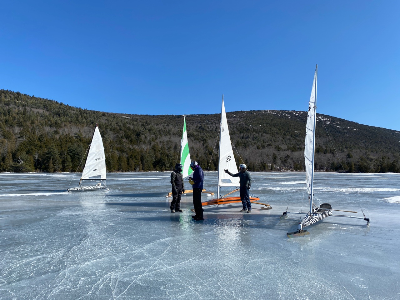 “Four boats sailed Eagle Lake today with better than expected wind. Ice stayed hard but the surface was somewhat lunar. Cheapskate clocked 37 mph over the bumps.”