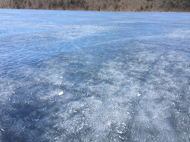Similar surface scouted on Chickawaukee this afternoon. Very hard surface in full sun at 35 degrees. Launch ramp a bit dodgy, but ok for DN’s walking the plank. 12″ found on the snow ice just off the ramp. 7.5-8.5″ thick directly out from the turnout 150-450′. Hole stayed dry the whole way down; not a drop of seepage. Hard grey ice.