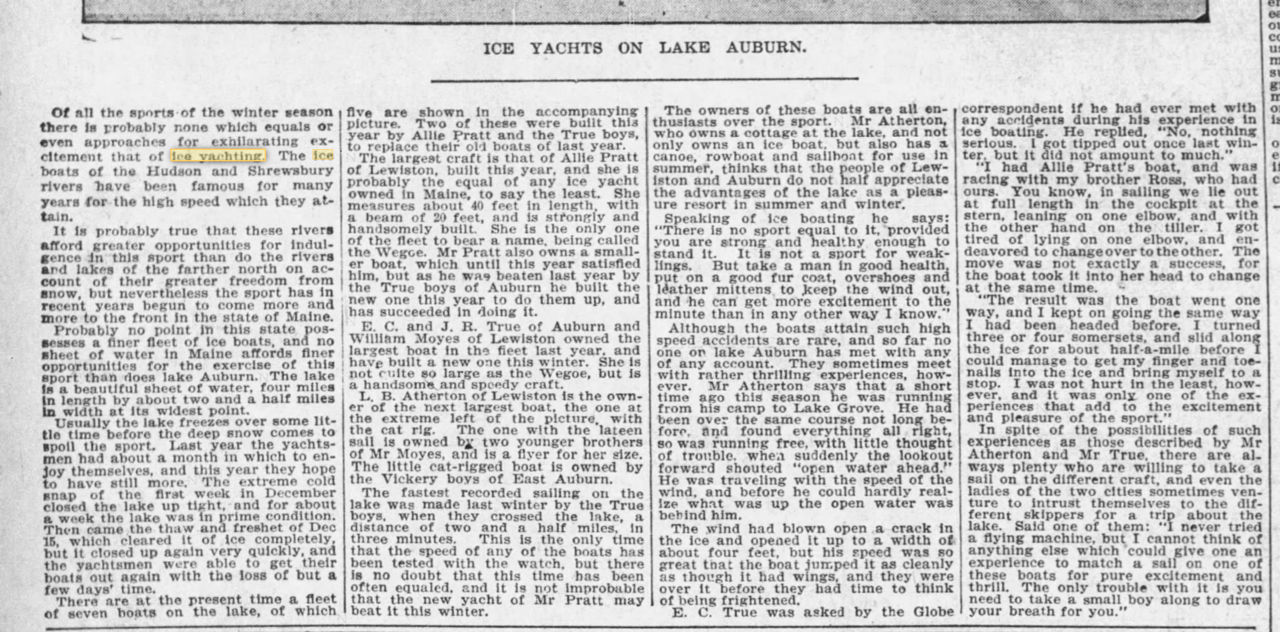 Sabattus Pond has been on the iceboating radar for many years, but up on the other side of the nearby city of Auburn is Lake Auburn. There’s nothing in the CIBC history about this lake, but according to the article below it was well sailed at one point. Are those big stern steerers still hanging from the rafters of lakeside barns?