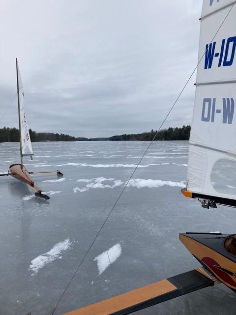 After a lay day, the fleet turned out in fine style for some of the best conditions we’ve seen here for a long time. The wind built to a low roar over the course of the day. Cheapskates, Skimmers, a BlowKart and the usual suspects blasted from the very bottom of the River to the pressure ridge at the middle of the North Broads. And back. The ice up there was polished black ice under a veil of blowing snow.