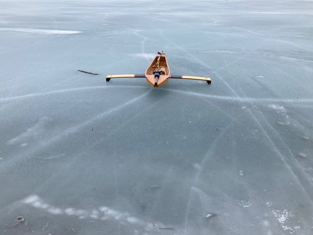 Hiking, sliding around the turns, the ice never failed, even at forty-five degrees. Note the lack of runner tracks in the photo. It almost looks photo shopped the way the boat seems to float on the surface.