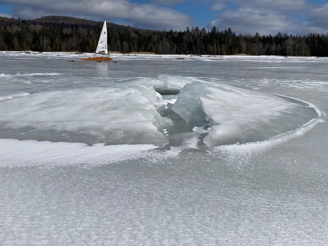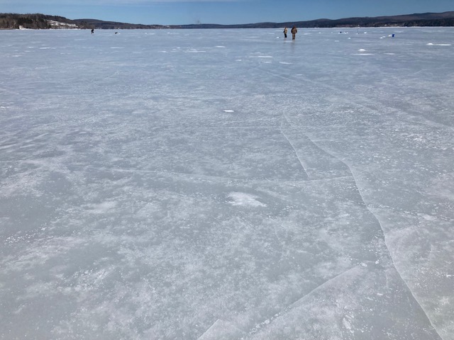 That’s all well and good, but the big news for anyone who wants to sail is that Lac Megantic is ready. Sixteen inches of good ice observed in a fishing hole, smooth grey surface with no snow, good access with no moat at Piopolis on the west side of the lake.