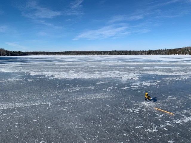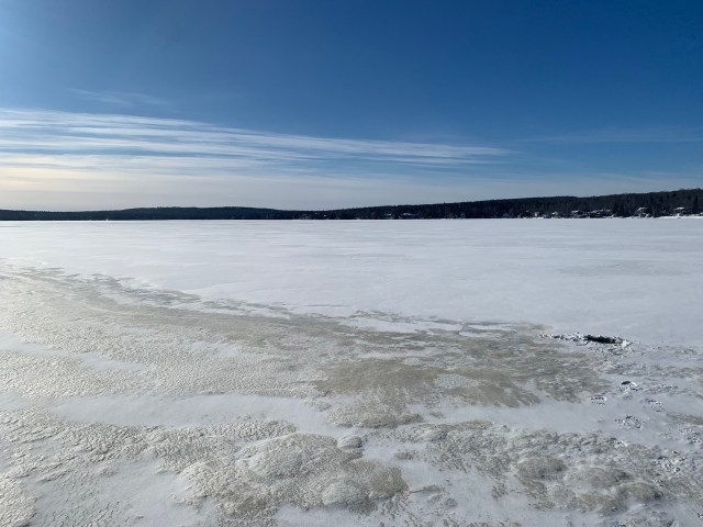 Just across the border in the little village of Ste. Aurelie lay two of our early lakes: Lac Joli and Lac Abenakis. Denis Gueertin went ice checking today and found three inches on Joli and two on Abenakis. Sadly, the ice is covered with a crusty mess; they’ve been getting a consistent dripping of snow for a few days. But there is rain in the forecast, just enough to tidy things up, hopefully.