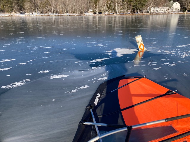 The bay at the boat launch ramp was part of the new plate. Access to the rest of the lake was blocked by snow, but with the wind blowing up and down the bay gave us some fine sailing.. There are a few large holes along the far side of the bay.