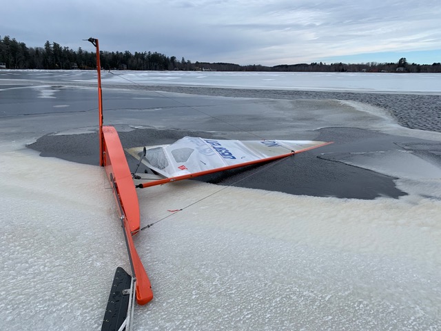 No harm done to man or boat, but a good lesson in coming equipped for the day. Know the forecast, know your gear, and if sailing a DN when there are hazards present, sail sitting up. Some might say that sailing near any open water is a bad idea. Fair enough, but that would easily cut our sailing days in half. And this season, where finding sailable ice is more challenging than ever, that’s just not an option. Remember Tunk? When the entire middle of the lake was open and we could sail right around the perimeter? Great fun.