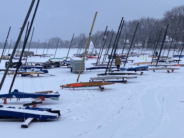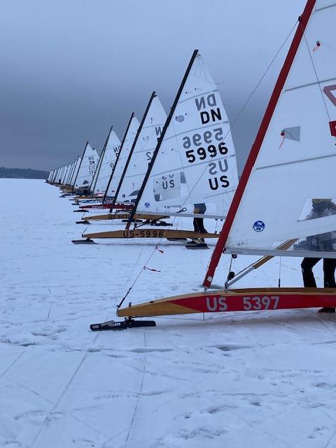 The first morning of racing in the Fiftieth anniversary of the DN World Championships dawned grey and white. An inch of dry snow dusted the fleet of over a hundred boats.