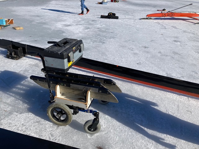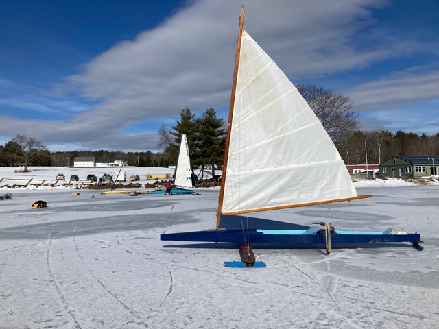 Sounds like one our our wonderful days in late March. Not this year. That’s how it was this weekend at Lake Farm. Yesterday there were about fifteen boats from all over New England. A Lockley Skimmer made the trip all the way from the Orient Ice Yacht Club on Long Island. Way to go Heather! Mike came up from Massachusetts with Herb Chamberlain’s old NorthEaster. He made great use of a retired walked for bringing tools and runners down to the ice: