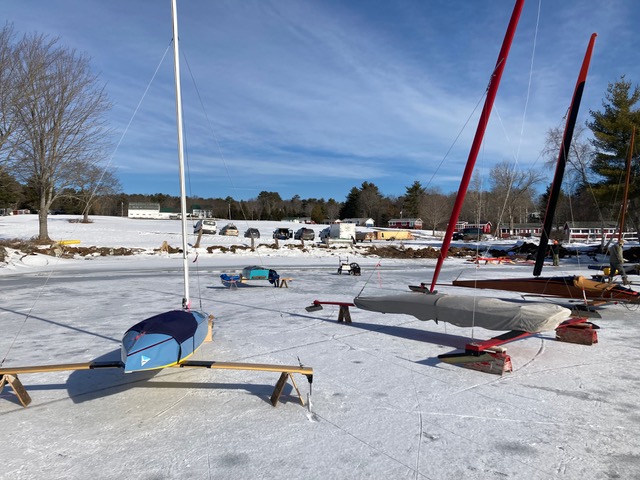 Ben Fuller rigged his new stern steerer STREAK, sorting out set up details. Sadly, most boats are off the ice. A few DN’s might be there tomorrow, but other lakes are getting checked as we write. Might be better winds along the coast.
