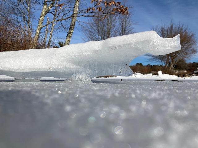 Big winds made for great sailing on the recovered surface. A dusting of snow before dawn fell into what remained of the undrained water, slushing it out and letting it freeze. There were a few drain holes, some marked, the others dodged. Shell ice blocked access to the Narrows, but there was plenty of real estate in Great Bay.