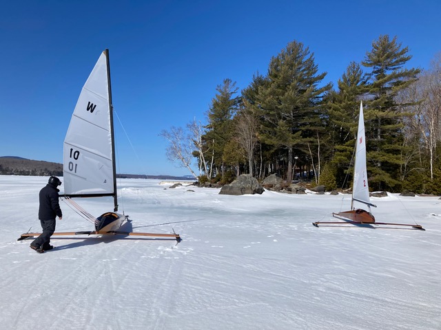 It’s a long beat to Kineo, but there was only one healed crack, no pressure ridges, no holes, all the way up. The small fleet mostly stayed together, and after a small celebration they decided to continue north, around to the back side of Kineo, or at least to drop in at The Birches to see if the restaurant was still open. DN’s have a hard time packing food.