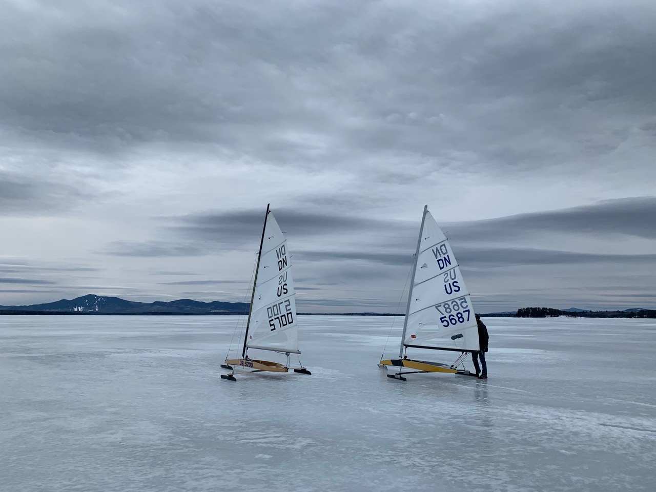 "I came to Lambton by noon today. I had to meet my contractor and the windows company. Everything was done by 13:30. So I went to check the ice. Nice surface, no more snow, mostly hard with some shell ice not very deep. Go: time to set up the boat! Wind was ok, just enough for the DN rig. And the skunners to sail over the soft spots and the shell ice. I was on the ice at 2:30.
