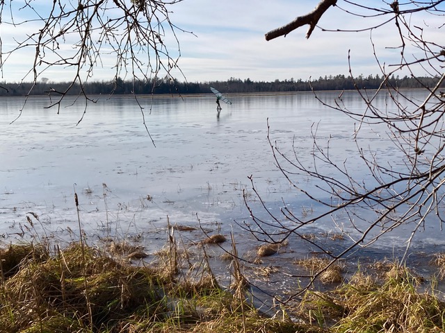 Today reminds me of the time many years ago that Lloyd and Jory drove to Plymouth Pond to check the ice at about this time of year. They’d been watching the weather and had a hunch. What they found was two inches of black ice, very sailable. All they had with them was an ax. No boats, no skates.
