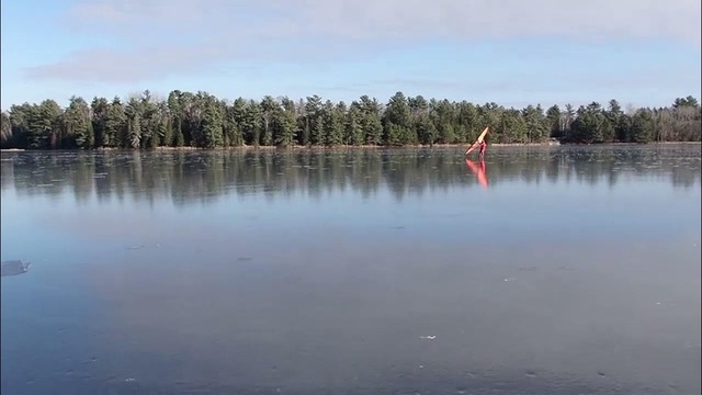 Today on Farm Pond, near Howland, we found this lovely little launch leading out to two inches of almost black ice, thanks to Bob Lombardo. Almost black because the plate has been rained on, snowed on rained again and then froze. It’s been through the mill, but the surface was excellent. There was one spot that returned consistent zippers, but at the same thickness as the rest of the plate. Interesting.