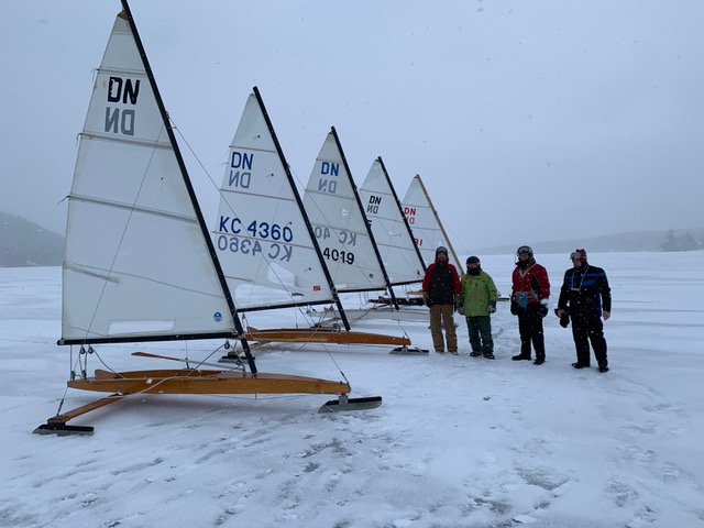 Five hungry sailors sailed today on Lac de Huit, near Thedford Mines. The surface was streaked with snow this morning, but the ice under was hard and the wind was strong enough for fast sailing. The snow fell for most of the day until it was pretty much all covered but no one complained, although Denis did say that after Pushaw this was a nice reality check!