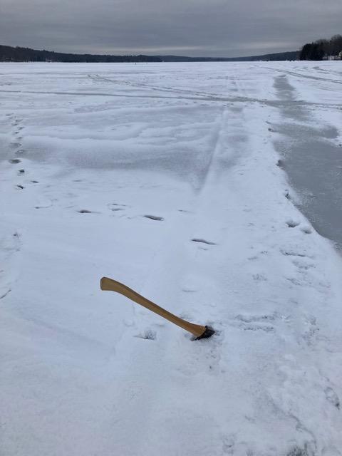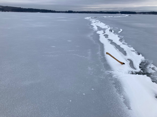Ice is hard and 7” thick. Most of the snow does not hide a slush pit. There is about three miles of good ice before hitting snow near the north end.