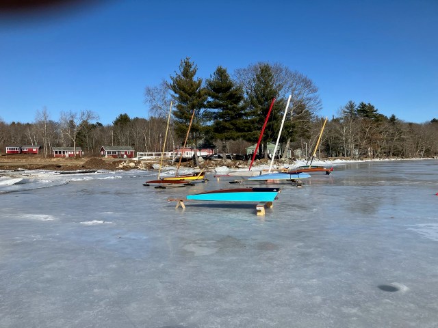 Well things didn’t workout as planned today. Ten boats showed up to sail. There was plenty of wind and, at times, way too much. Combine that with skim ice over the areas where the snow drifts had melted into puddles and you have some hairy sailing because either your rear runners would break loose from the ice and the boat would skid sideways or your steering runner wouldn’t bite so you couldn’t turn while you were barreling towards shore. The forecast called for the wind gusts to slowly drop but I saw no sign of that happening while I was there. Most of the boats went out several times to see if things improved, but by 14:00 it was pretty clear that we wouldn’t be comfortable sailing today. However, it wasn’t all bad because everyone hung around and gabbed in the bright sunshine. Eight of the ten boats were left on ice so we could do it all over again tomorrow. (See Photo Below) The forecast is for temperatures as low as 10 degrees tonight and more moderate SW winds tomorrow. So I’m looking forward to a better day tomorrow.