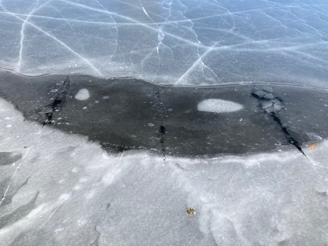 While it’s probably not time yet to cue the corpulent contralto, today sure had the feel of a late season day. Sun in the face, mud on the feet, and open water around the edge. But the ice was still in full winter mode: hard, smooth and fast. Drain holes were an issue after all. One Lockley got ripped apart, but the skipper was ok. And whoever made these tracks below ought to buy a lottery ticket.