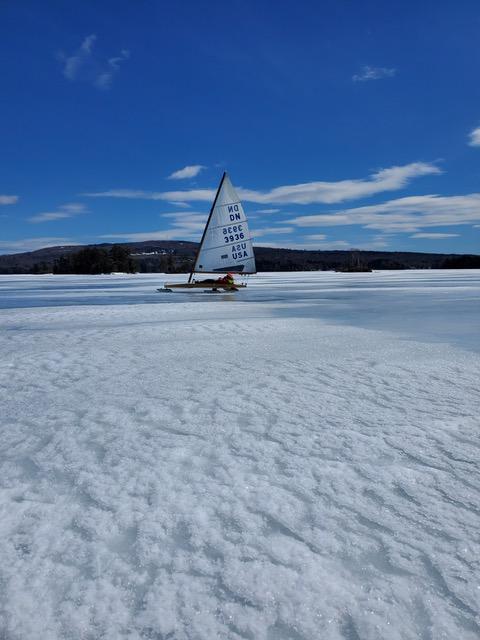 “The iceboat season almost made it to April. The ice on Moosehead this morning was rough but sailable. Mostly hard with some places with a 1/4in thin layer of ice on top of a thin layer of air, and below the stronger ice sheet, so the runners were going through 1in here and there but the good wind was getting us going no matter what. The sun was out, with 31°F and NW 12 knots wind at 9am. We setup at Kelly’s landing and got spotted right away by your spy. We sailed two in the same boat and scouted thoroughly the cove first. We played it safe because we were the only ones on the ice all day, we didn’t go over the pressure ridge near the islands (the closest to Kelly’s landing we crossed together last time). We prefered to make sure there was no hidden hazards in the cove and stayed there even if it was very gusty. We found two drain holes 3 feet wide that froze again over night. The ice was 14 to 16 inches right around the holes edges so the plate is still quite strong, I just don’t know if it’s strong everywhere. We marked the holes with branches and sailed around two improvised marks. By 12-1pm the surface was getting soft with 39°F and the decreasing wind made sailing two in one boat challenging. We had a late lunch at Kelly’s to finish this wonderful Easter day and headed back to Orono.