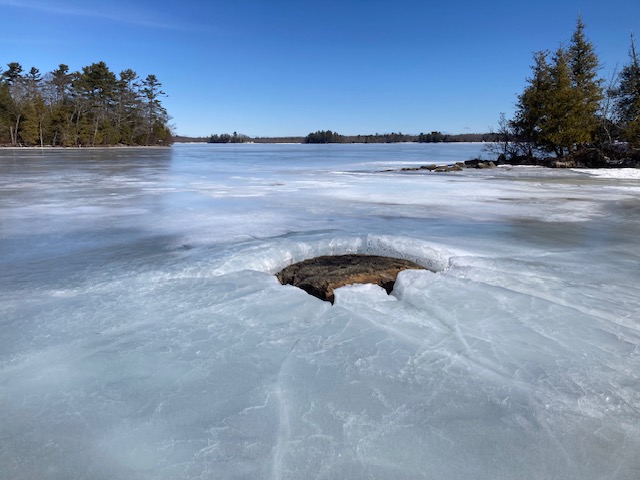 Great ice at Pushaw today. Top to bottom sailing, a dozen or so boats. Lighter winds forecast for tomorrow but a few boats will show up and give it a shot. There was moat water over the ice alongshore and at the launch ramp. It will probably freeze tonight, but take care if you get there early. It’s the yellow stuff in this photo: