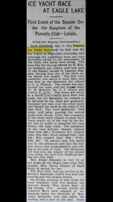 Following along our theme of history, Michael Young discovered this clipping from the Bar Harbor Register. There is reference to a Cup, which was the main trophy of the Pemetic Ice Yacht club, of that fine town. That prompted Micheal to search for the Cup. It led him to the Philadelphia Art Museum, the vault of the Bar Harbor Bank and Trust, the local historical society, and conversations with local auctioneers. No Cup yet, but keeping in mind how the Van Nostrand cup was lost or forgotten for many years, there is still hope. And look at that cup now!