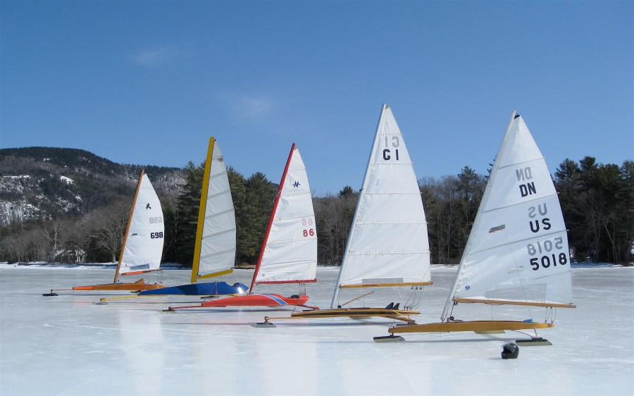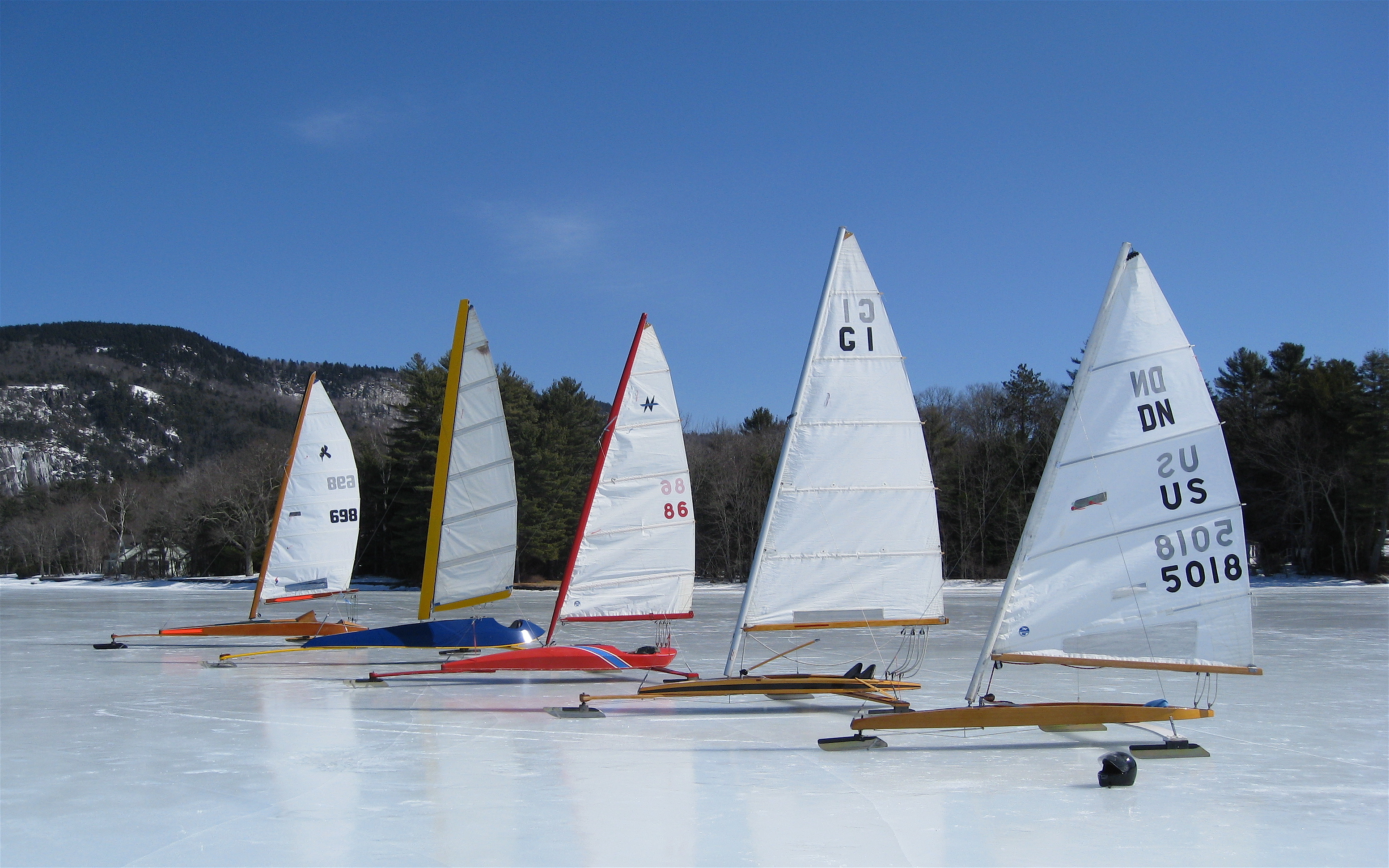 Ice this rough makes for a bone jarring ride, especially in a DN. But with wind and sunshine and the whole of Sebago ahead, one accepts the comprimise.