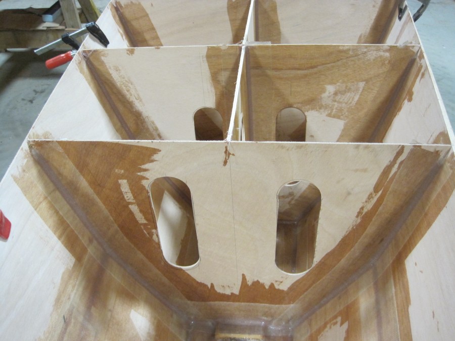 Bulkheads are filleted and glassed on both sides. Best to lay the glass when the fillets are semi-soft to avoid having to sand them.