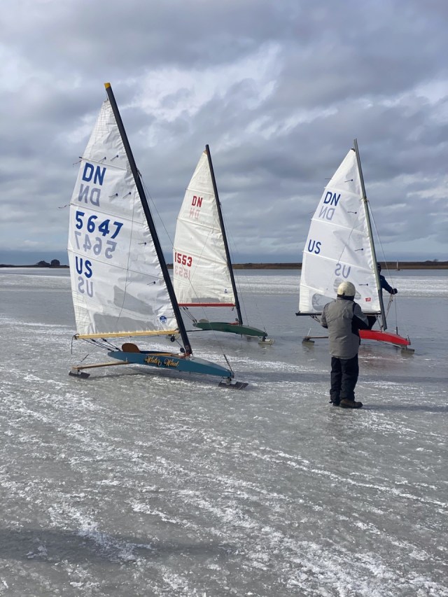 We must admire the guy’s spirit. Snow is all we have all over, so if there’s a breeze on a sunny day our insides just cry out to go sailing. We attempted it ourselves here last week to no avail, probably thankfully. Not much of a recovery anywhere in the forecast, but the cold snap coming might button up lakes on Cape Cod. So for now, just relax and make a snow man or go skiing.