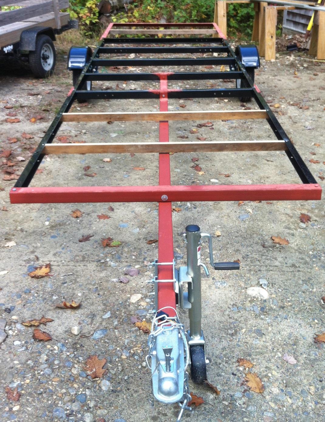 I began the process by combing Craig’s List for a suitable trailer to modify. The trailers I located were all quite expensive and not quite what I needed. I therefore bought a 5’ x 8’ trailer kit (Model 37552) from Northern Tool and Equipment Co., now on sale for $499. The kit includes 12″ tires, wheels, axle, springs, hitch, tubes and channels for the frame, and lights. The kit comes unassembled and does not include a tongue jack.
