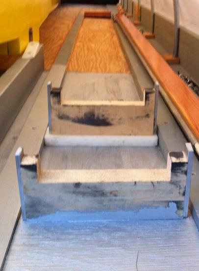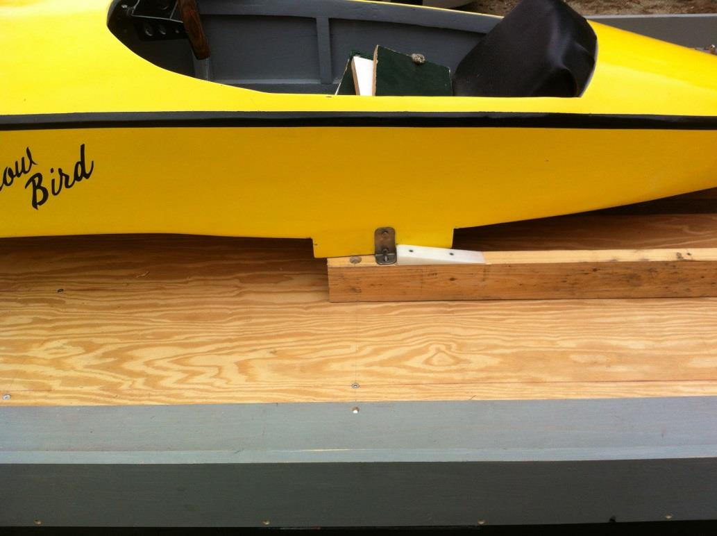 The image above shows the upright 2×4 used to hold Yellow Bird up off the steering cables. Note the UHMW wedge that keeps YB from sliding aft. There are also two ¼” studs that can hold the boat down while under way if needed.