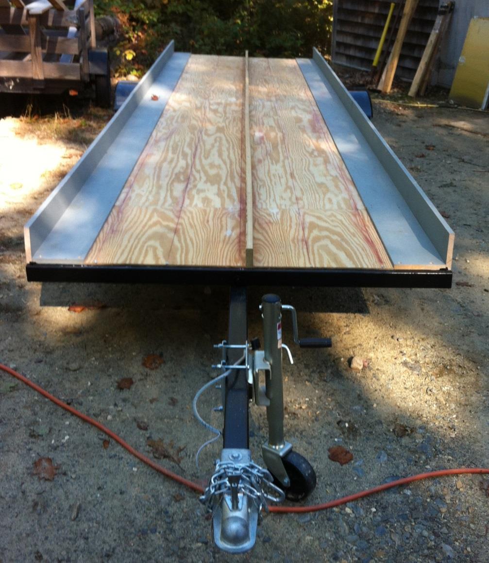 The aft extension is a bit hard to see in the photo but is all 2” x 2” x 1/8” angle iron. It is bolted to the main section with plates in the same manner as the forward section. In retrospect this may be a bit under built. The trailer now has a slight sag back aft. I am not sure what would be the best way around this. Perhaps welding that section rather than bolting it.