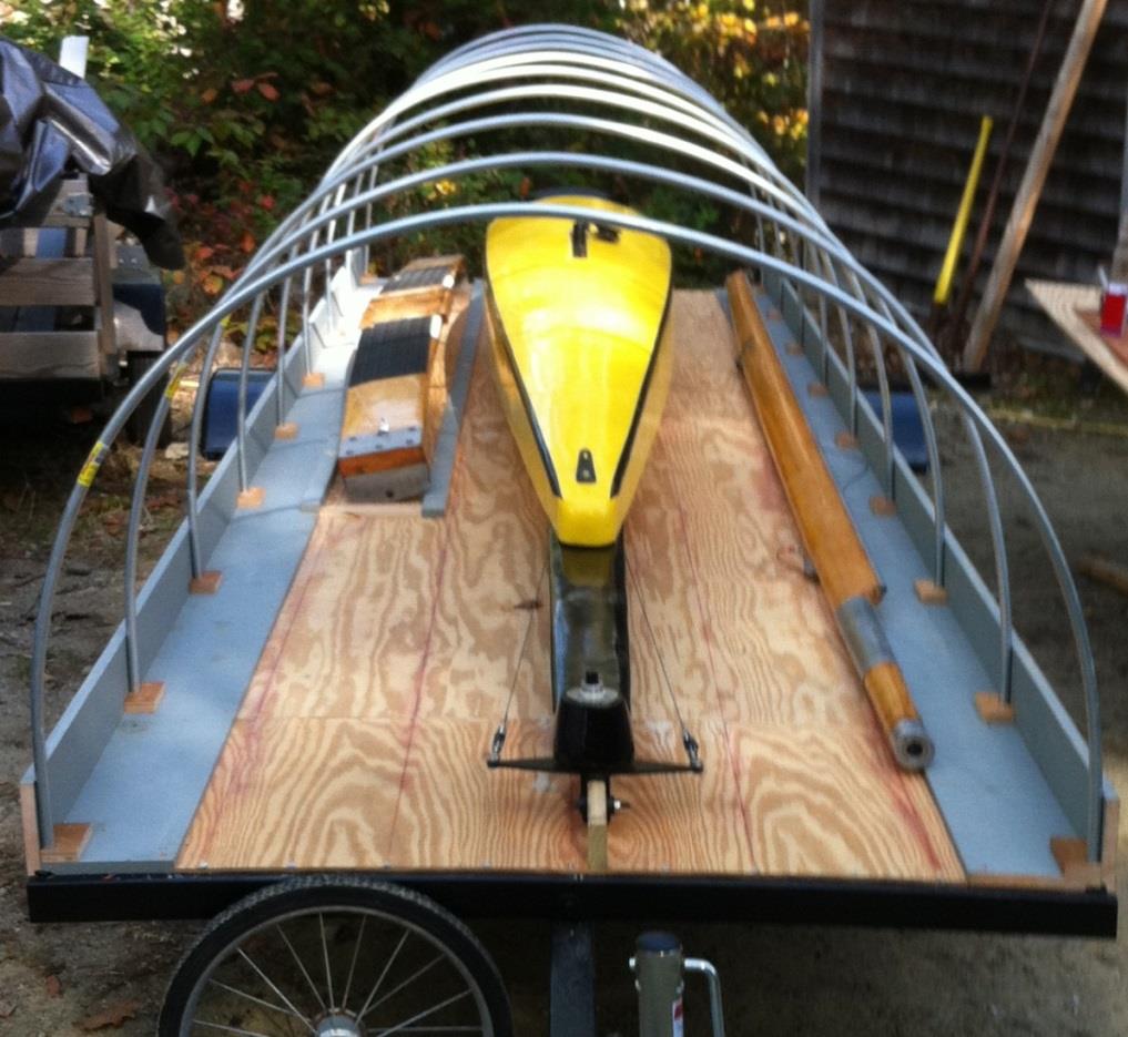 I modified a set of wheels that came with YB so I could bolt them to the brackets on the side of YB that normally mount the plank. To load YB into the trailer, I wheel the boat around holding onto the spring board. I slip the forward chock over the central wooden upright and slide the boat forward until the hull comes close to hitting the edge of the trailer. I take the wheels off YB and lift the boat up so that the plank brackets slide along the side uprights. I slide the brackets over the UHMW wedges and down over the ¼” studs. For short trips this is all that is needed to hold Yellow Bird’s hull in place. I can put nuts on the studs if needed.