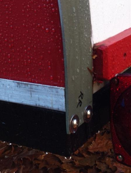 After the shrink wrapping process was complete, I bolted a strip of G10 (fiberglass) 2” wide by 1/8” thick to the trailer frame on one side and bent one over each of end bows. This could be aluminum, too. Then I bolted the far side to the trailer frame. To hold the G10 in place along each end bow, I glued each of them to the bow. I used panel adhesive on the inside and white silicone caulk on the outside. The G10 sticks out from each bow 1” and flush with both the end of the trailer frame and the aluminum angle which creates a recess for each door. The doors therefore, are bordered on the top edges by the G10 and held in on the bottom by the aluminum angle. It might be better to give the G10 a quarter inch overhang to help keep the water out.